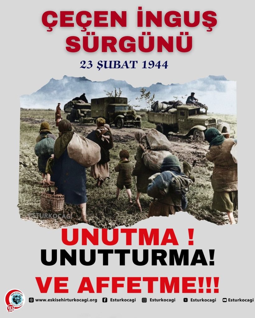 23 Şubat 1944’te Katil Stalin tarafından Sovyetler Birliği’ndeki Türk ve Müslüman unsurları yok etme planına uygun olarak; yerlerinden, yurtlarından, vatanlarından zorla ve canice sürgün edilirken hayatını kaybeden Çeçen-İnguş’ları, sürgünün yıl dönümünde rahmetle anıyoruz. #ÇeçenİnguşSürügünü