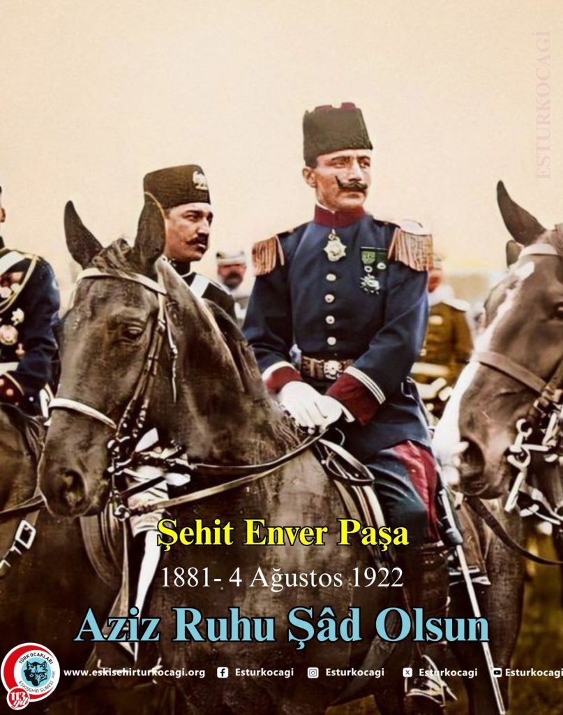 Türkistan’ın İstiklâli için mücadele ederken Pamir Dağları’nda bulunan Çeğen Tepesi’nde Rus-Ermeni mitralyözlerine karşı yalın kılıç taarruz ederek şehadet şerbetini içen; Sarıkamış’ın, Çanakkale’nin, Kut’ül Amare’nin; Erkan-ı Harbiye Reisi ve Harbiye Nazırı Şehidi Âla Gazi-i Namdar Enver Paşa’yı şehadetinin 103. Yılında rahmetle ve minnetle yâd ediyoruz.