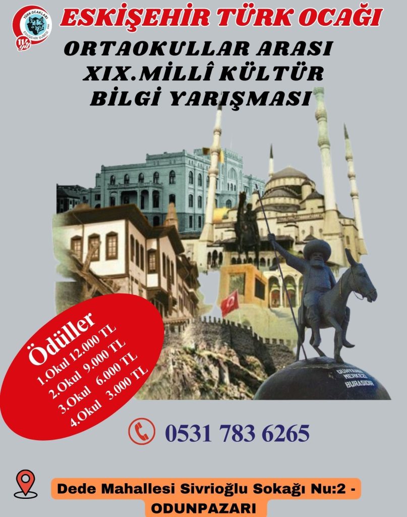 Eskişehir’deki Ortaokullar arasında bu sene XIX. sunu düzenleyeceğimiz ödüllü “Ortaokullar Arası Millî Kültür Bilgi Yarışması” müracaatları başladı. Artık geleneksel hale gelen Millî Kültür Yarışması’ndan öğrencilerimizin bilgiye ulaşmaları ve millî kültürleriyle dost olmaları bekleniyor. Elemeli olarak devam eden bu yarışmalarda öğrencilere eleme turlarında 15, finalde 20 soru sorulmaktadır. Yarışmanın kurallarını belirleyen şartname Ek’te takdim olunmuştur.