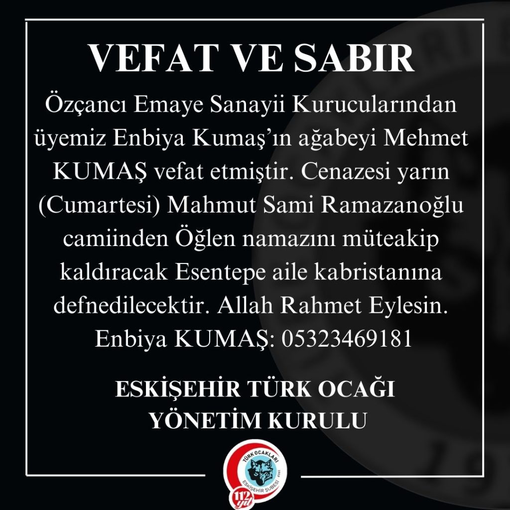 Özçancı Emaye Sanayii Kurucularından üyemiz Enbiya Kumaş’ın ağabeyi Mehmet KUMAŞ vefat etmiştir. Cenazesi yarın (Cumartesi) Mahmut Sami Ramazanoğlu camiinden Öğlen namazını müteakip kaldıracak Esentepe aile kabristanına defnedilecektir. Allah Rahmet Eylesin.