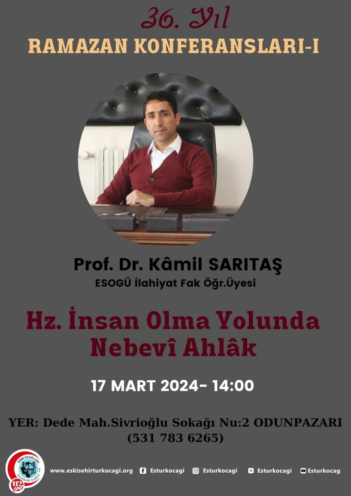 36 senedir Ramazanın her pazarında yaptığımız gibi bu senede Prof. Dr. Kâmil SARITAŞ tarafından verilecek “Hz. İnsan Olma Yolunda Nebevi Ahlâk” konulu Ramazan Konferanslarımızın ilkinde beraber olmaktan bahtiyarlık duyarız. Yazı gezinmesi 16 Nisan 2023 Ramazan Konferansı Prof. Dr. Kâmil Sarıtaş -17 MART 2024 RAMAZAN KONFERANSI