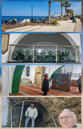 Türbe ’de şirin bir mescit ve mezarlar var, bahçeye çıkıp dolanıp mağaraya gidiliyor, orada Melih kardeş içeri girdi, aman dikkat ıslak yerler diyerek fotoğrafını çektim. Türbenin üst kısmındaki tepeye şirin bir cami yapılmış, alan yürüyüş parkurları ve oturma mekânları ile deniz kenarında harika bir dinlenme ve inanç turizmi mekânı haline gelmiş.